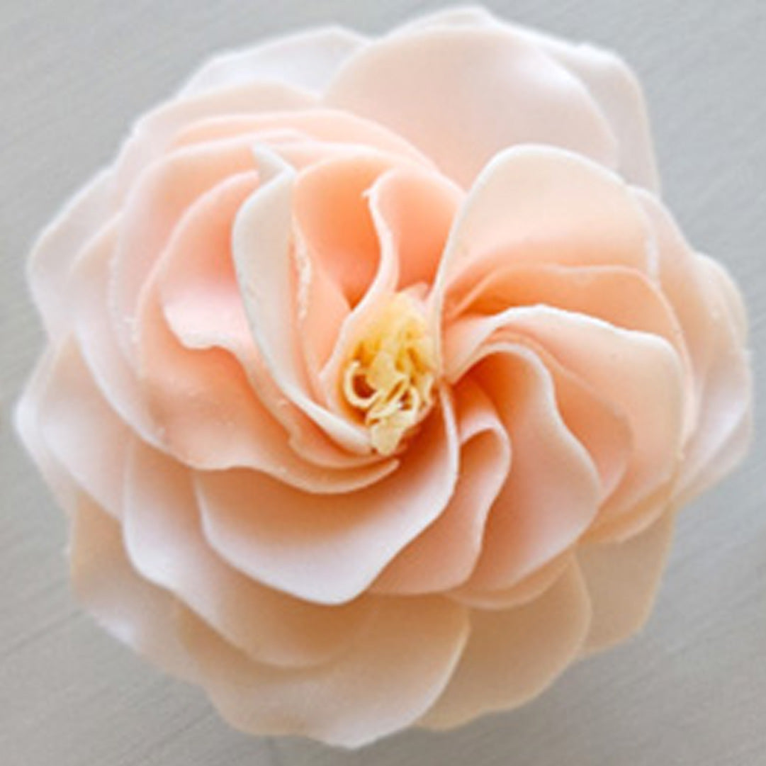 Belle – French for “beautiful”, has layers of coral, tangerine, and pink. Inspired by beautiful grace and the gentle layers it wraps around us. This flower set in a creamy white soap pedestal.